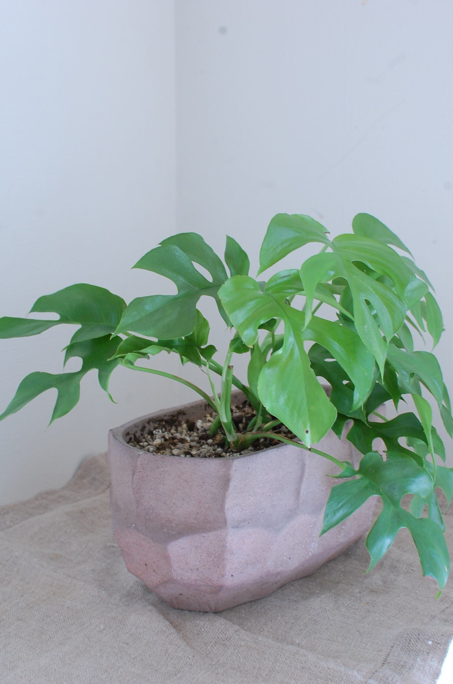 葉に切れ込みが入った美しい姿が人気のモンステラと姿は似ていますが、実は、ラフィドフォラ属。流通名として、ヒメモンステラと呼ばれています。育て易く、そのコンパクトさがご家庭で管理もしやすく、人気です。土の表面が乾いたらたっぷり鉢底から流れるほど水をやり、鉢皿には水は溜めないように、都度捨てます。直射日光は避け、明るい室内で管理しましょう。